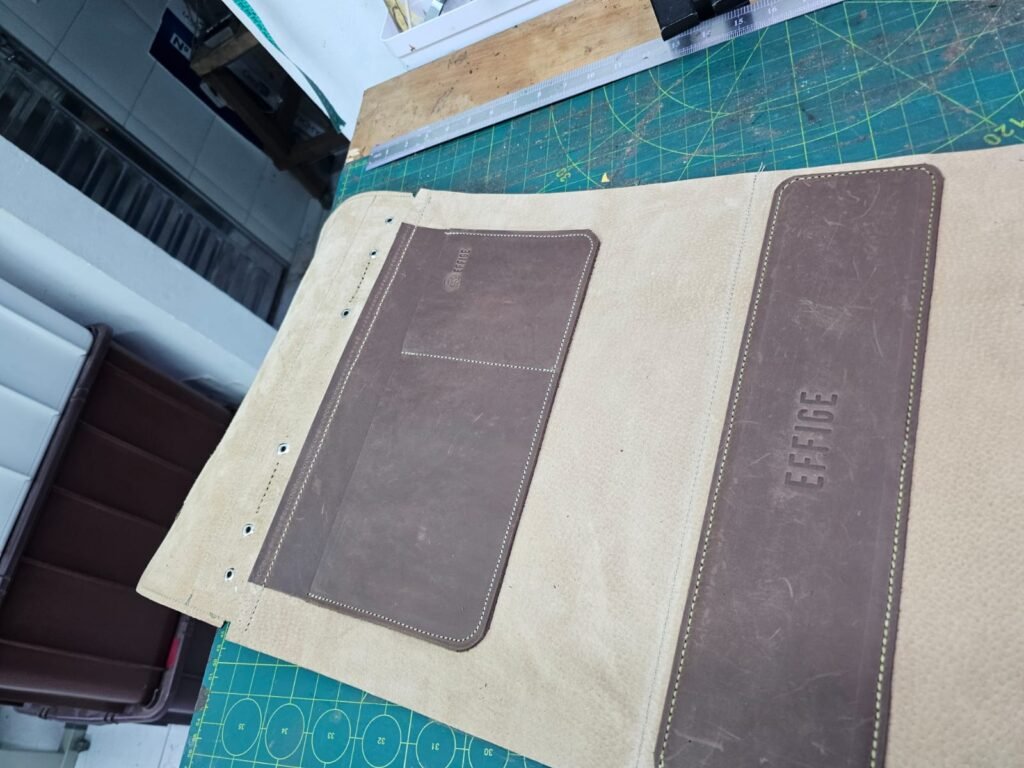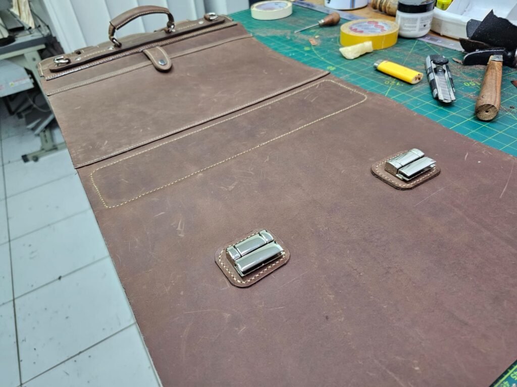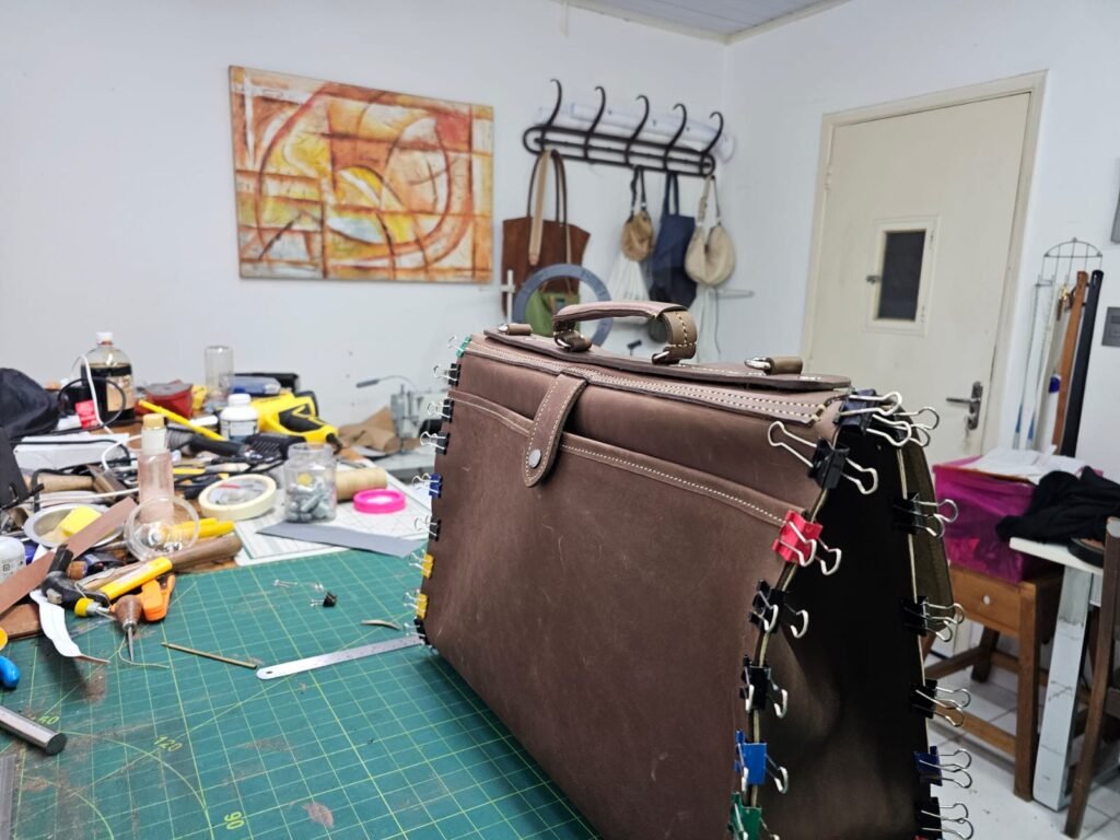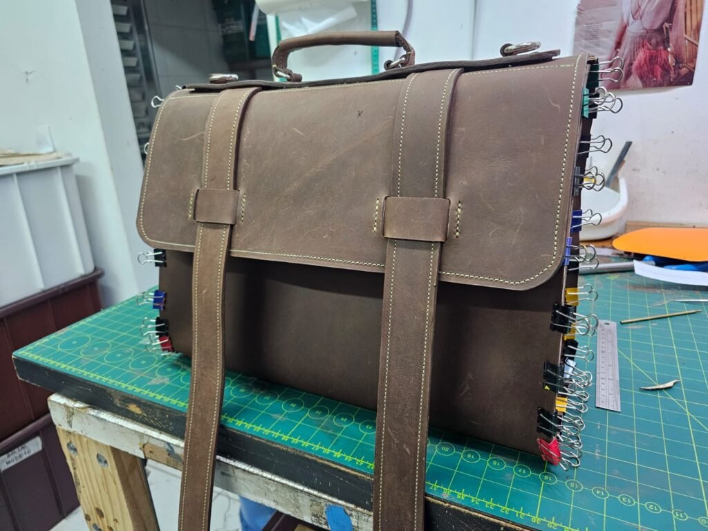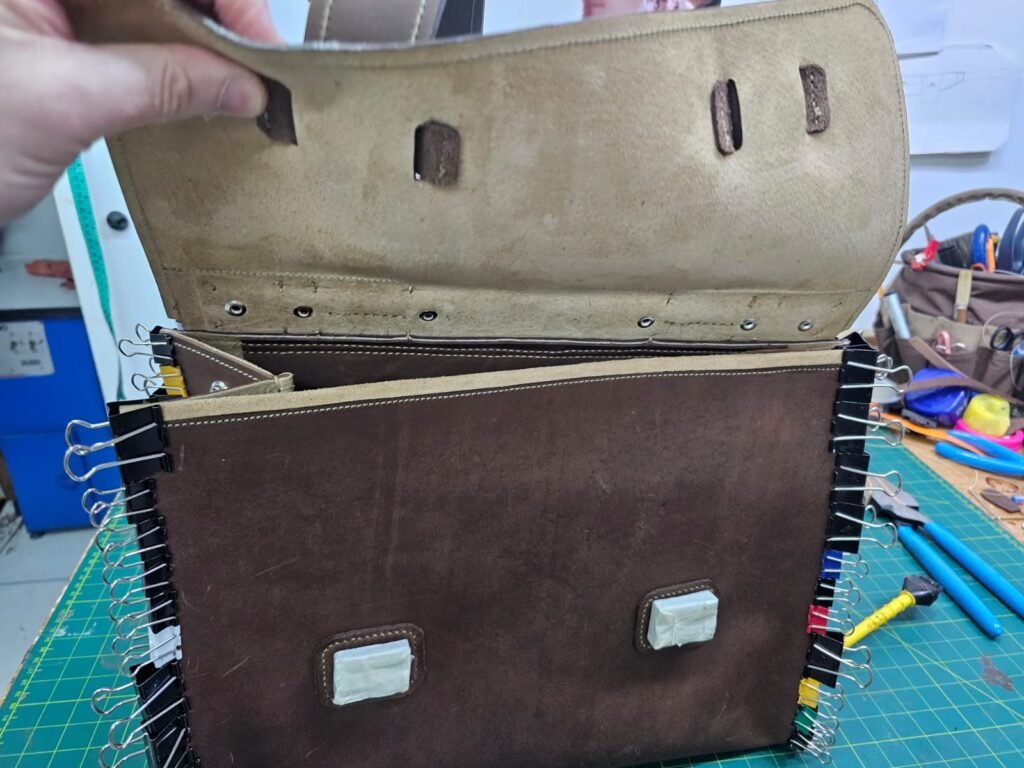 Com as partes mais importantes costuradas com ponto de selaria , feito ponto a ponto manualmente a messenger bag tomou a sua forma final e foi preparada com carinho para o doutor André.