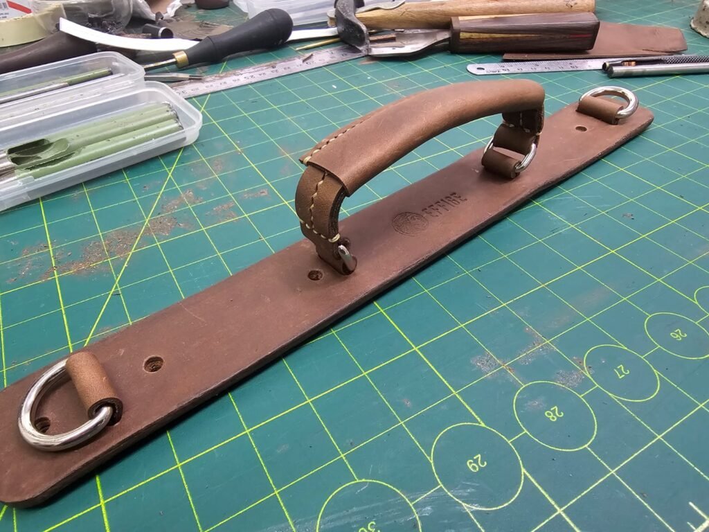 A Alça, costurada à mão teve um cuidado especial para que fosse envolvente e adaptável ao peso aplicado na utilização deste peça.