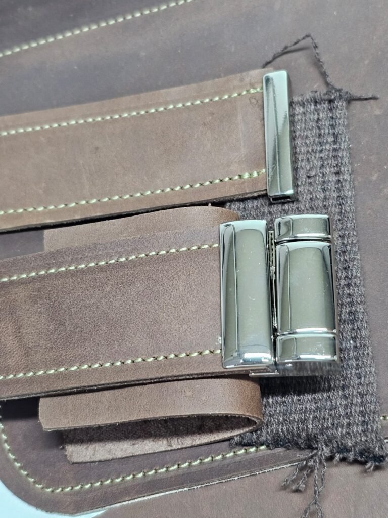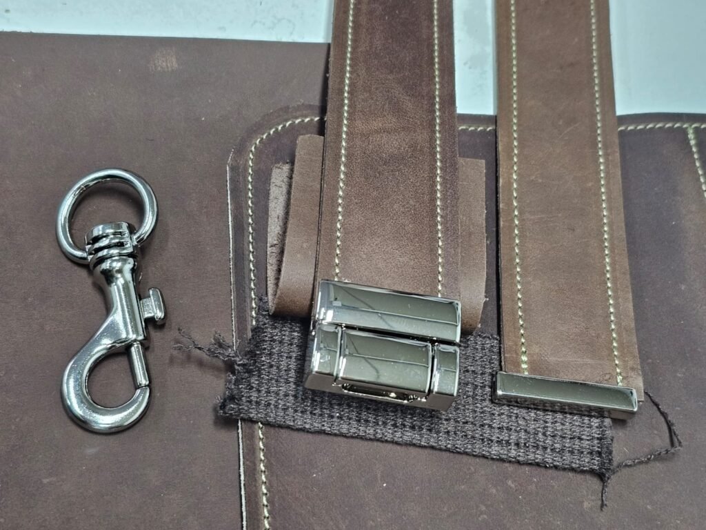 As peças depois de cortadas e o forro de couro tipo mestiço aplicado, foram costuradas umas às outras para a costura e montagem final da bolsa